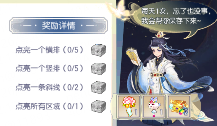 每天可以拼1张图,一共能拼25天。每日拼图时,会从图中随机抽取一个格子点亮,每拼完一张图都可以获得奖励,其中,通过拼图点亮每一个横排、竖排以及斜线,都能打开一个奖励包。