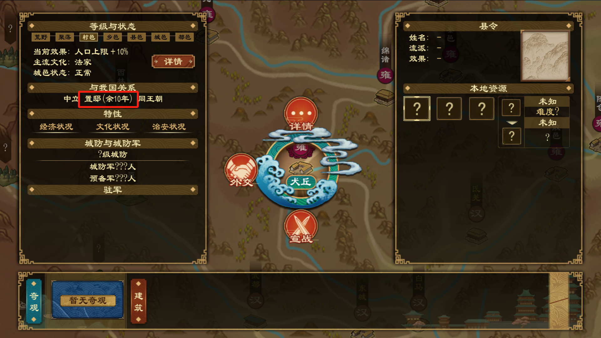 当我方与对方存在“置邸”关系时,双方宣战、结盟、断交、请援、借道、和谈、威压、求书、合历、撤间、赎回、粮约、借粮、战略、征伐、邀盟的外交行路时长将减少75%,且会根据使臣的外交能力增长双方的信任。
