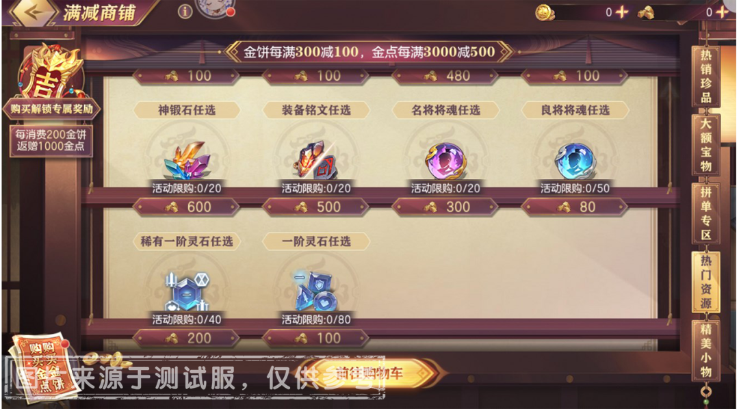 活动期间,满减商铺将限时开放,在满减商铺中,小将军将以金饼每满300减100、金点每满3000减500的优惠价格购买各类热销商品。若小将军同时持有贵宾令牌,更可同时享受每消费200金饼返1000金点特权!