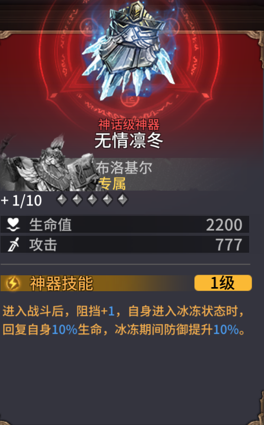 专武可提升阻挡数量,更能发挥自身的功能性价值;在自身进入冰冻时还能恢复生命、提升防御,进一步提高生存。如果没有专武,可用堡垒戒指(提升阻挡、减伤)、女神护符(提升防御)下位替换。