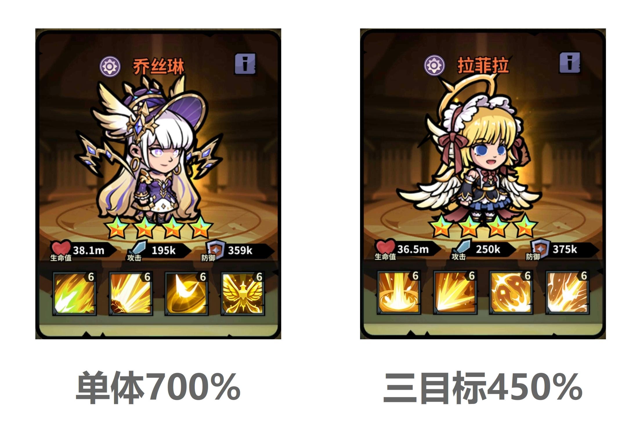 乔丝琳和拉菲拉都是全异常增伤,对处于流血、灼烧、中毒状态的目标都能造成伤害增加。乔丝琳满技能的增伤加成为700%,是游戏内单体增伤最高的英雄。拉菲拉是游戏中唯一的群体增伤英雄,满技能的增伤加成为450%。因为拉菲拉是同时攻击3个目标,她实际的增伤加成应为450%×3=1350%。