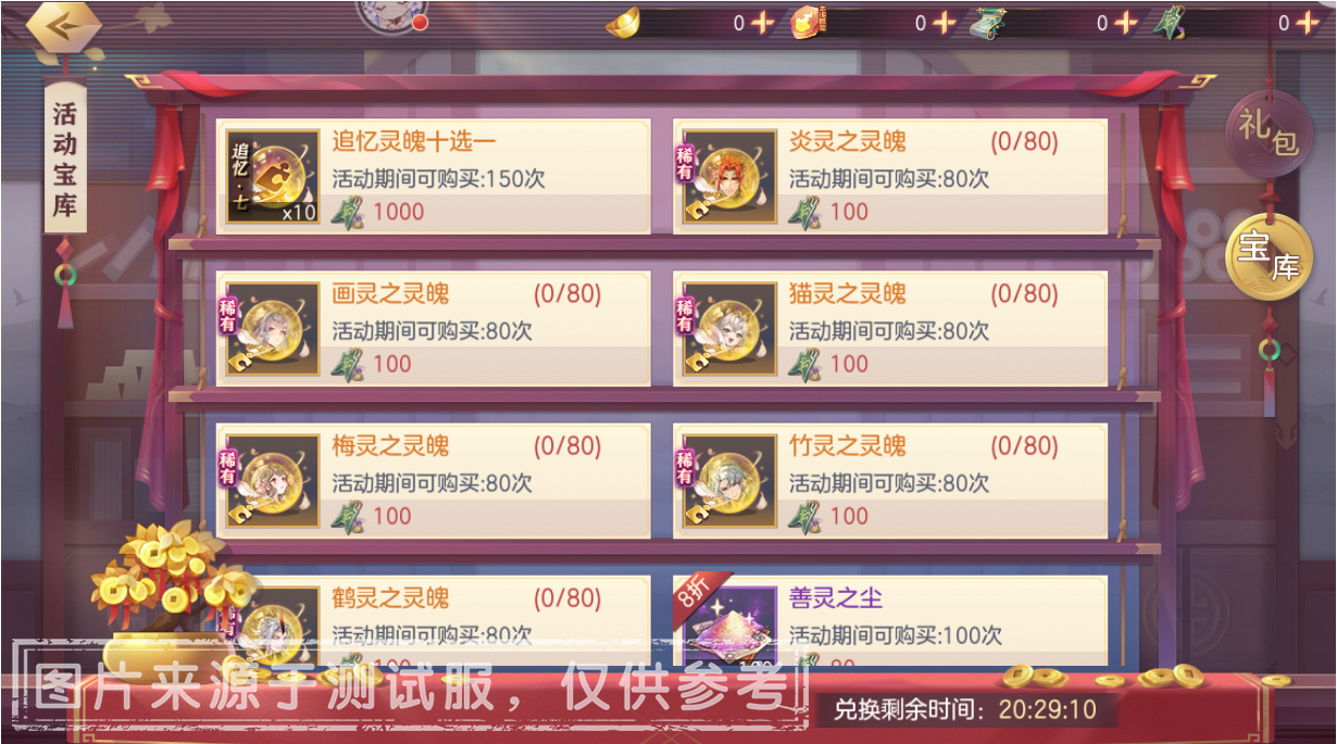 活动期间,活动中获取的善灵币可在活动宝库中兑换往期善灵灵魄、寰宇古卷、淬灵玄石、淬灵星尘等奖励。