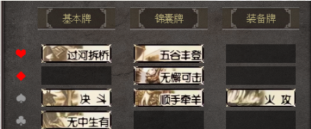 (何为组合:即每种花色<黑红梅方~4种>和每种类别<基锦装~3种>分别组合,刚好能凑出12种普通锦囊牌,见下图)