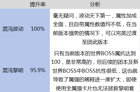 团本及后续世界BOSS的抗性均很低,加上团武的出现,黎明套的属强稀释进一步扩大,波动为天下第一。