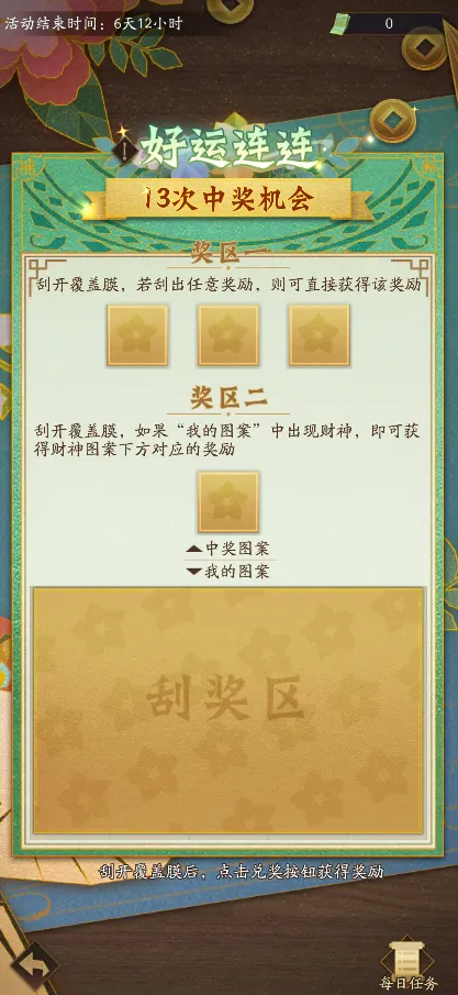 春日好运,正在派送中!每日可通过完成任务获取好运券,并通过刮开好运券的方式获取天相材料、飞升灵珠、神铸石、召唤券、寻宝仪以及海量元宝等海量奖励!每张奖券构成分为直接奖励区以及匹配奖励区,直接奖励区将直接获得奖励内容,而匹配奖励区将需要道友们刮开匹配区图案与奖池内图案进行配对,若图案一致即可获得这个中奖区的奖品!祝各位道友好运连连~