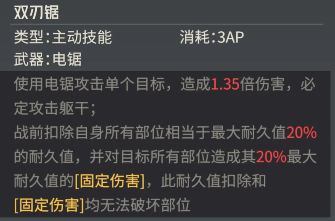 第三个技能【双刃锯】则是一个单体的输出技能,基础倍率为1.35倍,消耗3点AP,必中躯干???同时这个结果很有意思的一点是战前分别扣除自身和敌方20%最大生命值的血量,诶......所以看到这大家应该就有点明白了,这怀亚特表面上好像是一位奶爸,但实际上嘛......你懂的。