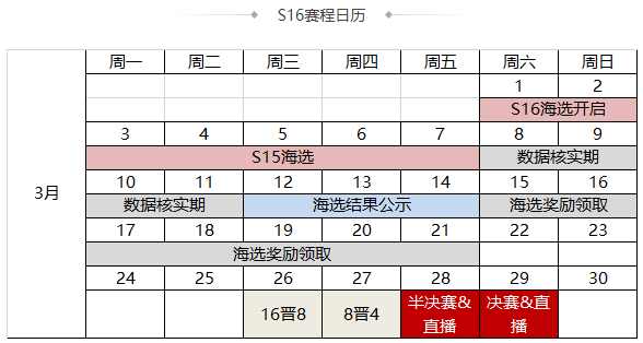 3月23日:精英赛16强选手确认,海选16强自行寻找队友组队参赛