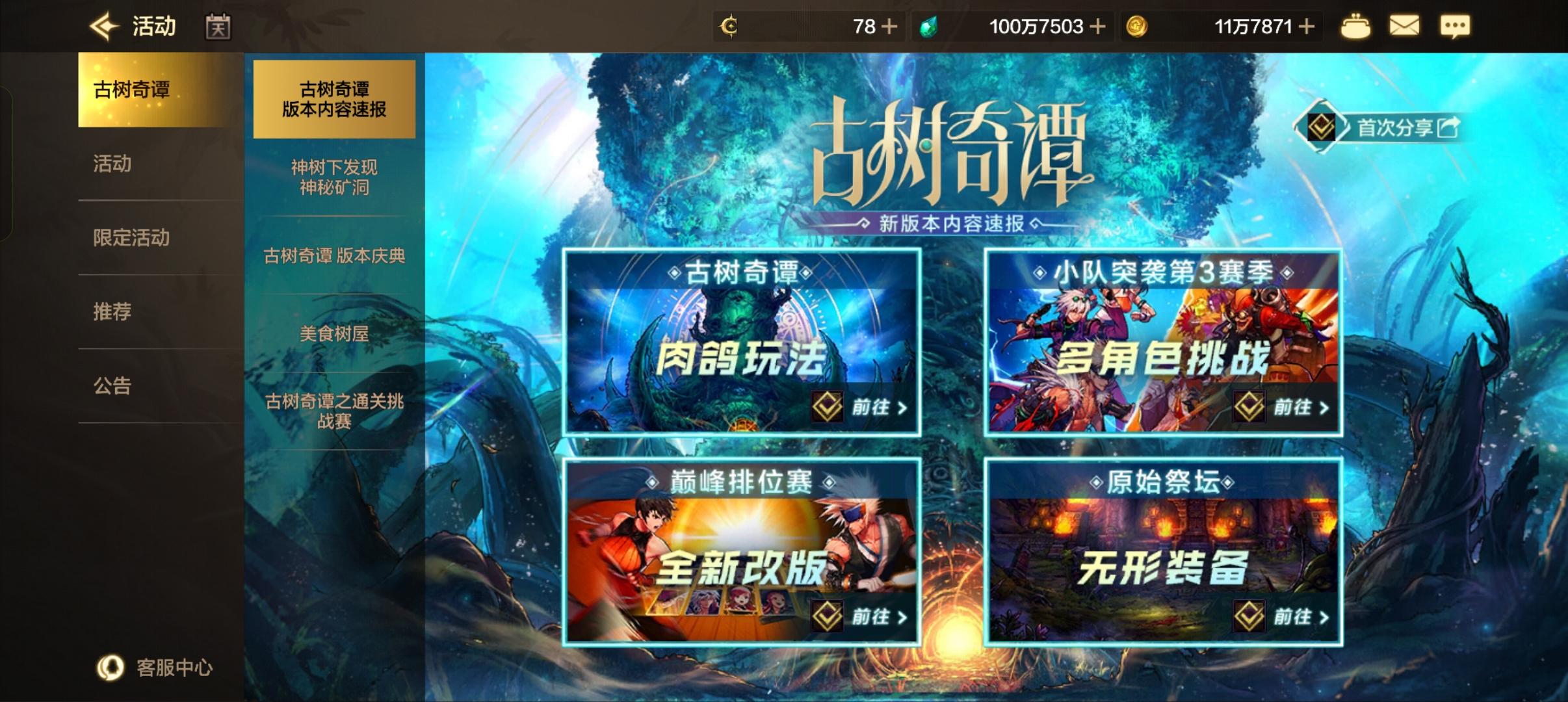 专题活动为当前版本最新活动,通常契合版本信息,入目前为“古树奇谭”专题,活动也会类似。而每个专题活动首页都会有玩法执行。完成以后还可以领取相应道具。