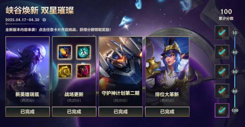 “超级新星机制”与“加里奥守护机制”开启,全新排位体验双重护航!截止至4月24日23:59,召唤师完成2场排位赛对局,即可领取龙魂水晶*100奖励~