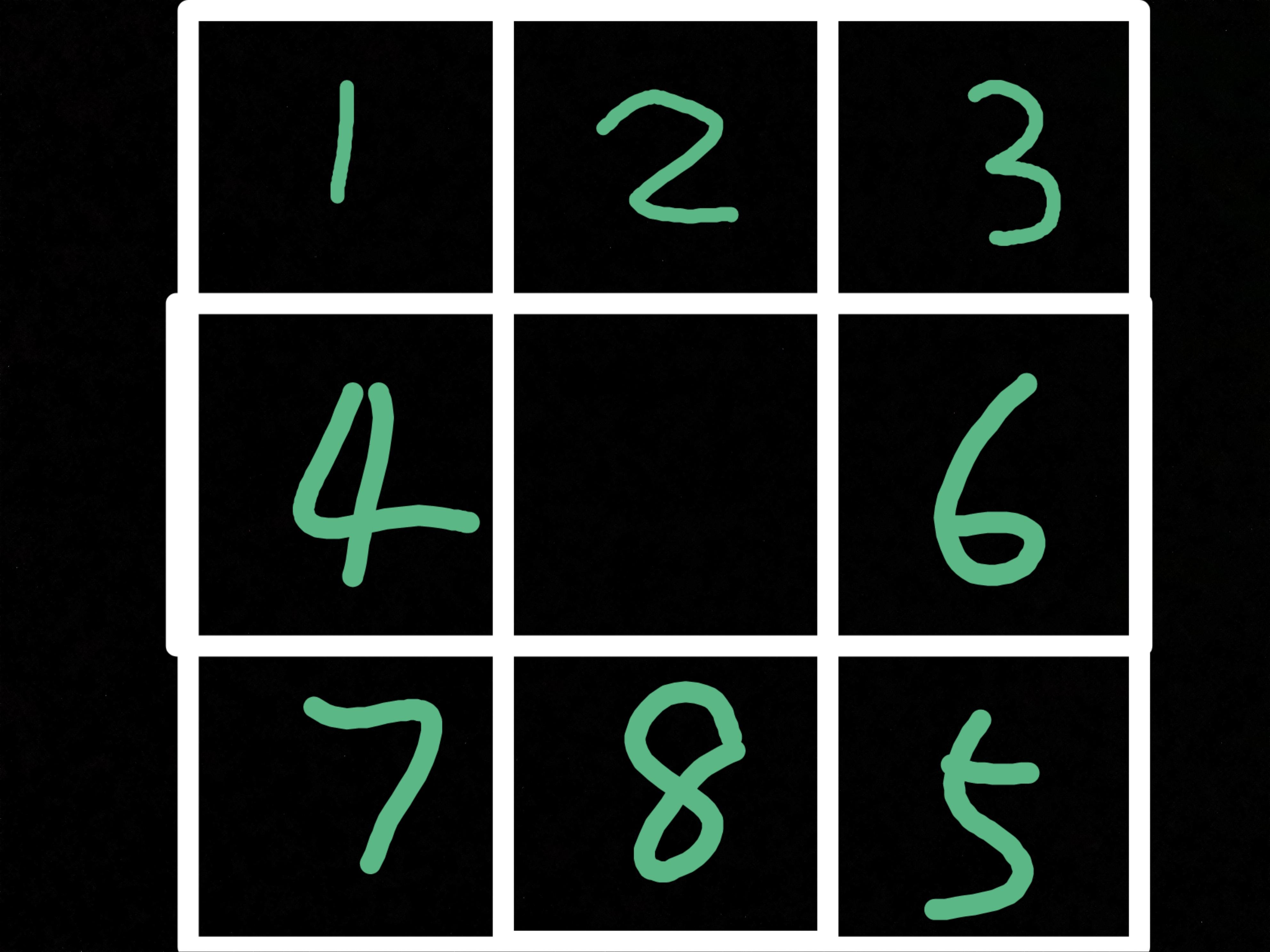 /*但首先要说明一点,因为游戏代码设计的,是将8个方块随便放入9格中,而不是把8个方块排好再打乱(就好像你把魔方27个块拆下来再组合),是有可能出现无解的情况的。