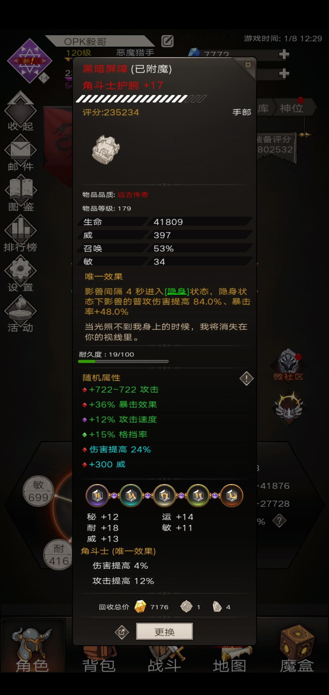 3.手部:选择护腕或者手甲,属性选择暴击效果,攻击力,威,格挡,伤害提高。