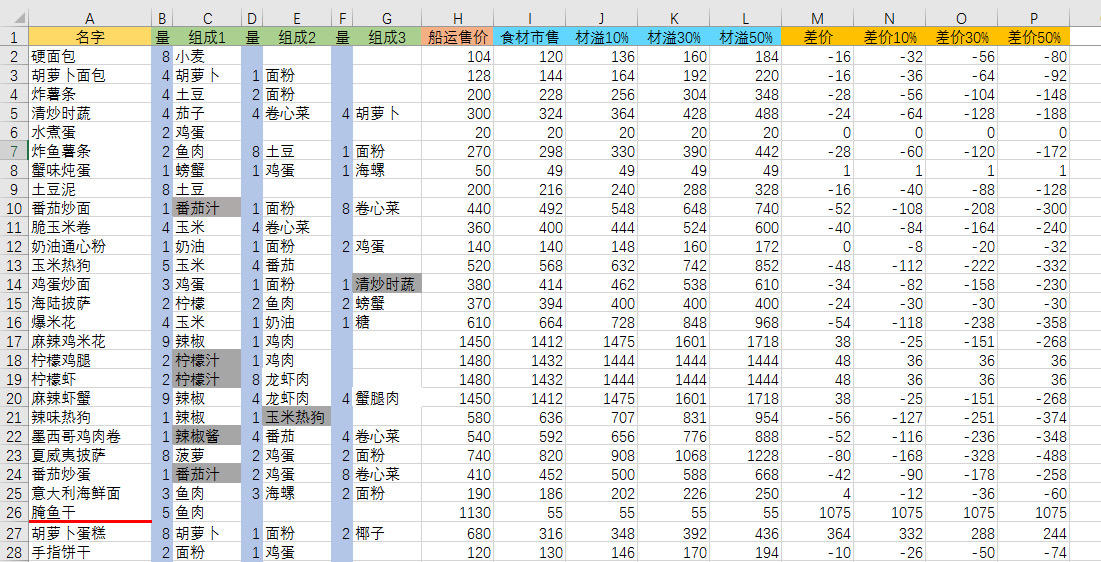注:每一种食材溢价情况不太一样,价格或许一天变化几次,所以本帖中的数据能准确固定的我固定,不能固定的采用统一溢价方式计算。船运自身随机性就很大,我只能在确保计算准确情况下,得出大概能多赚多少钱。 同样条件下,因部分船运材料高溢价,实际船运额外收益会比此算法略高。