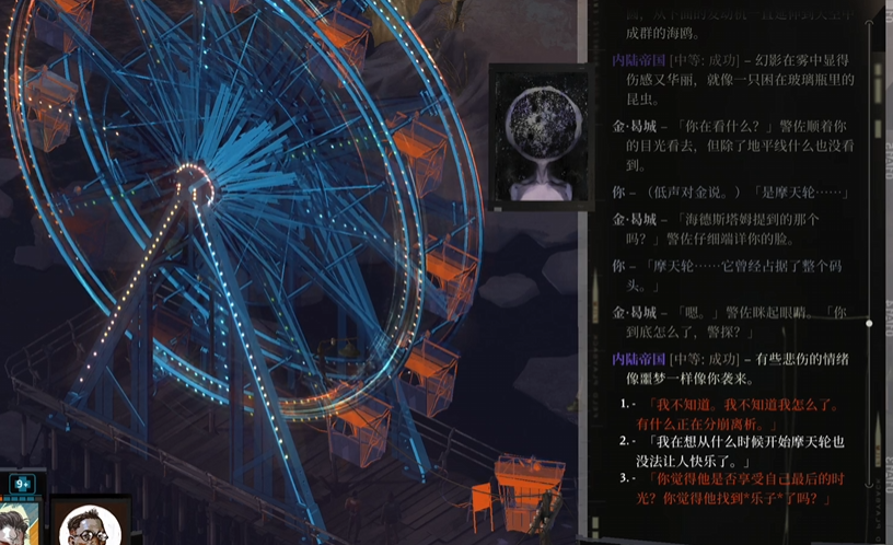你在废弃的教堂正中流着泪起舞,不断呼唤着已死的幽灵。你深知过去铅灰色的光早已折断,那仅存的余烬也搁浅在无风无浪的沙滩上;你也记得所有那些曾被称作梦想而今无人拾起的渺远回忆,不知何时沉默着消失在现世的废墟下,寻不到半点踪影。你看见在那之后的时间里,过去从未来席卷而下,吞噬迷惘的、解构的、沉醉的、悲恸的我们的影子。我们的影子汇聚为灰质,化为利剑刺穿极乐的梦。你因而睹见异象:天空中下起了沙丁鱼暴雨,世上的钟摆在落日时分集体停转。你听见神圣而可怖的空气撕裂所有影子与意义,嘲弄着你的无力。尽管你看不见它无形的利爪,但它正狞笑着钳住你脆弱的心脏。你看着曾是自己的千千万碎片此刻尽数溺亡在*何处*的死寂之中。何物在近处破碎。静穆的灰色使者伸出手拉起了千千万个你。“舞,”祂说,“只要迪斯科音乐还在响,尽管起舞。否则,与你的连接将永远消失,你将彻底陷落在灰域的废墟里。若你谙晓迪斯科的舞步,沉溺的你将浮出死水,逝去的你将再度凯旋。因为你是灰域的使者,也是灰域的审判者,纵使你的肉体筋疲力竭,你的心智惶惶不可终日——”你觉得有个熟悉的声音在呼唤着你。“——只有舞,”祂的声音飘飘忽忽,“舞步须出类拔萃,令你自身心悦诚服。这样才能从注定的毁灭中存活。要跳要舞,唯若音乐不停。”有一双手将你拍醒。金·曷城 - “你昏迷了很久,哈里。”爱凡客 - “过去即为未来,但未来已死!*hardcore*!”天人感应 [炼狱:成功] - 那个瞬间,你听见千千万种意识形态大醉而绽放的迪斯科极乐冲破死亡的权柄涌入你的耳间,你看见一轮新日唤醒了废墟夹缝间的幼苗,你看见新生的灵魂跪倒在今在昔在永在的辉煌理想前;细雨倏然间纷至沓来,洗去末光也洗去雾霭,使你不由得期待末后风恬日美的光阴。你看见旧日的摩天轮重现世间,在灰色的映衬下,它的木头架子在风中嘎吱作响。12个红色的座舱形成一个圆,从下面的发动机一直延伸到天空中成群的海鸥。内陆帝国[容易:成功]- 幻影在雾中显得伤感又华丽,像一只困在玻璃瓶里的昆虫。同舟共济[容易:成功]- 它发出的幽蓝黯光抚慰了你的心。落单的你,合一的你,多到数不清的你以火焰燃尽旧世界的残滓。你们穿越所有苍灰色的失意和挫折,在众乐团的交响诗齐奏音中迎接曾消逝的滚烫的希望再临,因为它从来便不曾离开过。从容自若 [困难:失败] - 你哭了,泪流满面。能说会道 [炼狱:失败] - 你被庞杂的信息流裹挟,试图组织语言但无功而返。古老的爬虫脑 - 时间在这里汹涌的流逝。它是湮没了一切呻吟的终极宁静。没有留下任何旧日依恋。边缘系统 - 做你想做的。[鬼祟玲珑 - 炼狱18] 没有语言,只是跳舞。