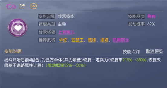 仁心能在前4回合触发,拥有高达350%的单体恢复率,能保证队伍中将领在承受多次伤害时不暴毙,也是保证核心输出兵力健康的关键,虽然低级时发动率较低,但满级后可达到50%的发动率。