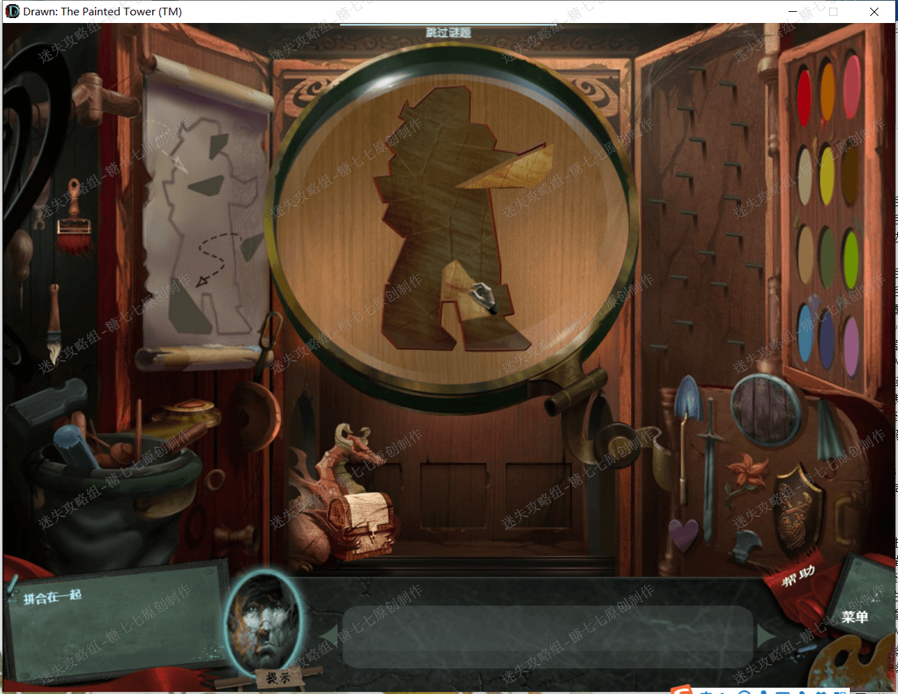 28、 然后把画布碎片放入破损的画中,再把右边面具的耳朵和左边面具的牙齿拿走,并用再湿抹布擦拭画,然后又进入画中。
