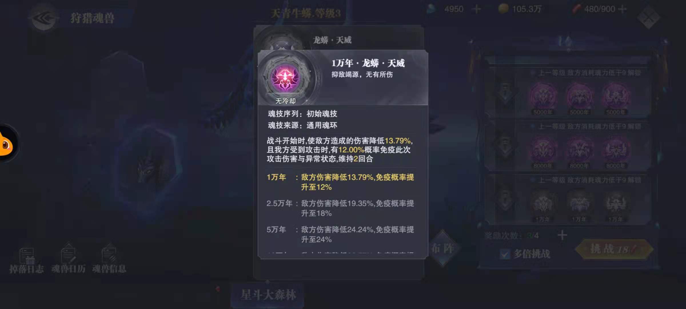 这里要敲黑板了哦[嗒啦啦2_托腮] 龙威是我觉得最实用通用的魂环,2回合的减伤已经概率免疫伤害和异常,这里的话之前魂师中存在概率免伤的只有一个鬼魅(羁绊中存在概率免伤),首先光是一个2回合降低伤害就完全可以给这个通用魂环3星的推荐,虽然免疫的概率很低,但是赌狗万岁,首先免疫的群体2回合,只要2回合内能抵消对方核心输出1-2次输出就稳赚,当前版本其实很少有人使用单体爆发魂师(比如柳二龙),使用的主C魂师无非就是风笑天、唐昊、锤三、剑尘,都是以群体面板伤害为主,2回合群体能触发1-2次核心的免疫就血赚不赔。