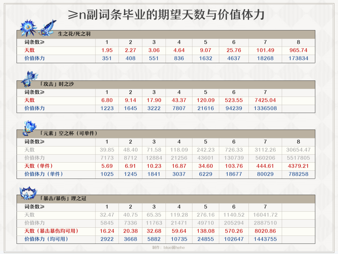 “价值体力”直接由期望天数乘上180得到,表格中杯和冠的灰字部分代表杯子不用单件时的情况(价值翻7倍),以及暴击暴伤头指定其一属性时的情况(价值翻2倍)