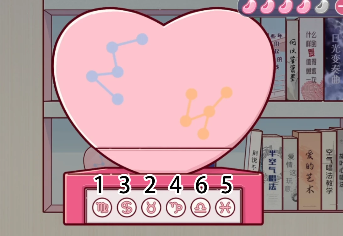 剧情过后再次来到小圆房间,查看床的场景,床尾位置书架上的盒子,盒子上一蓝一黄两个图案看起来很眼熟,打开手机看一看的确很眼熟,就是星座配对app的图标,查看一下将左边拖到金牛座的时候右边星座是处女座、金牛座、巨蟹座、摩羯座、双鱼座、天秤座,和盒子下面的图标刚好一致,那么按照这个顺序依次按下按键后盒子打开拿到一张照片和一块磁铁。