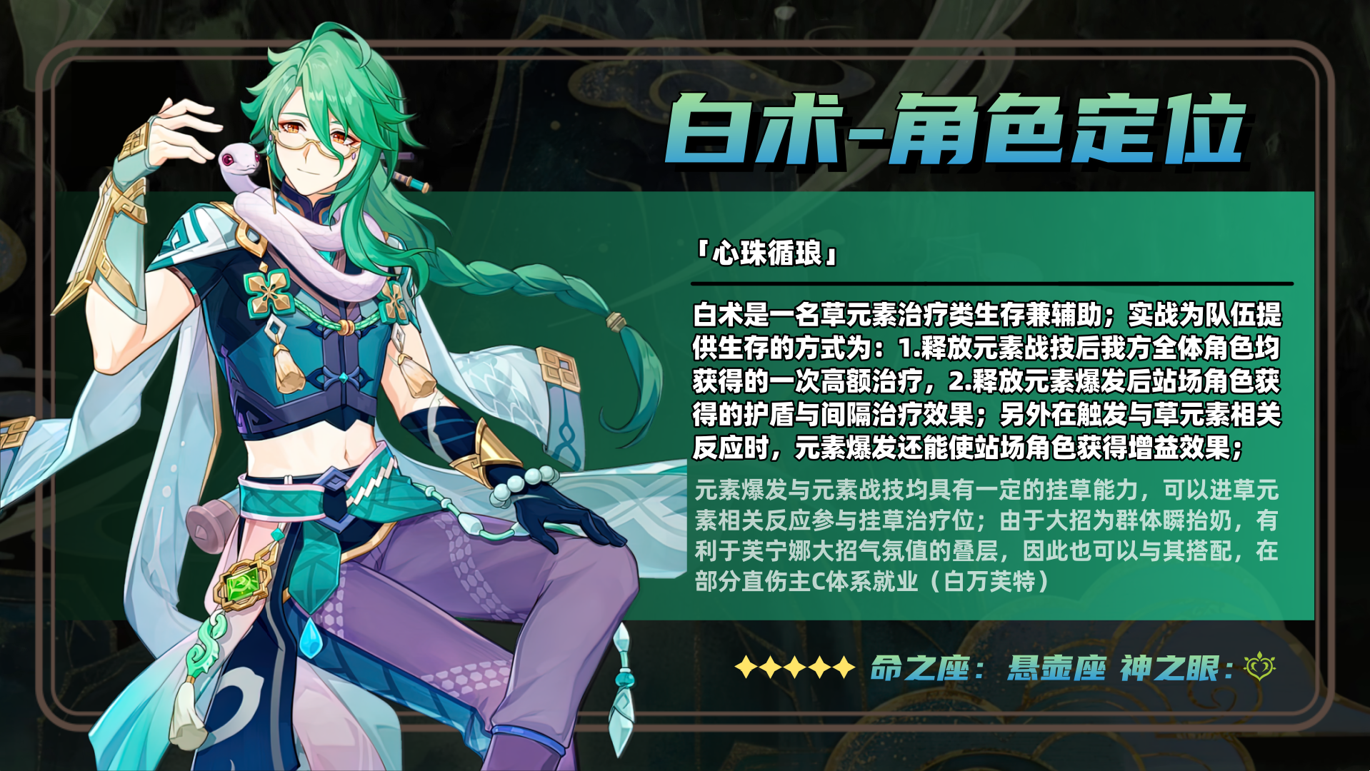 (写在前面:妙手回春的白大夫终于迎来他的第二次复刻,上次UP是在4.2版本陪跑芙宁娜,距今已有五个版本;经历了这么多个版本他是否还值得抽取,养成方面是否有所改变?本期就让我们来全面分析一下白术的相关攻略及抽取建议,其中包括机制全面解析、角色培养建议、角色配队推荐等多个方面,让你细致了解这个角色抽到及毕业!)