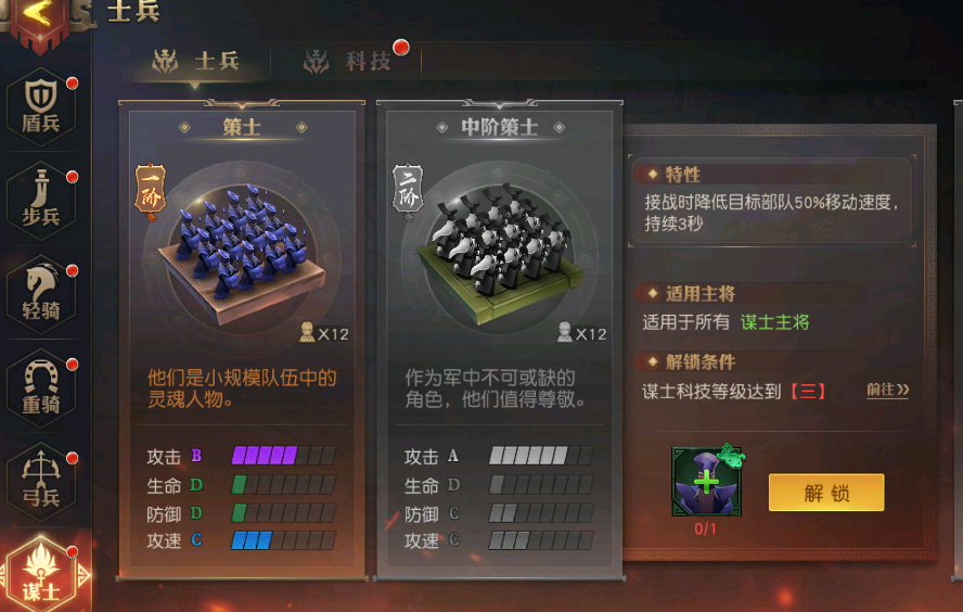 在解锁新的训练阶段之后,可以在图鉴中查看各类即将解锁、已经解锁士兵的属性。点击士兵对应的特性按钮时可以看到该类士兵所拥有的特有属性。
