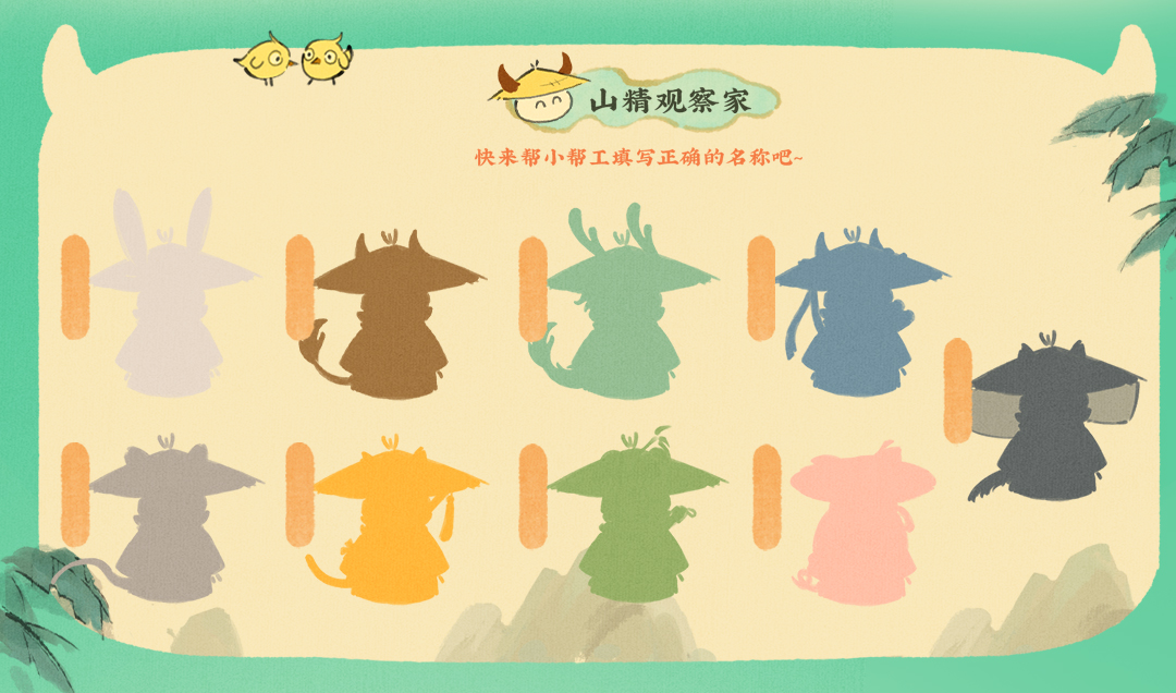 #山精观察家 左一:山兔兔 中一:山哞哞 右一:山花花 左二:山吱吱 中二:山吼吼 右二:山锦文 左三:山秀秀 中三:山果果 右三:山有墨 ID:1648240