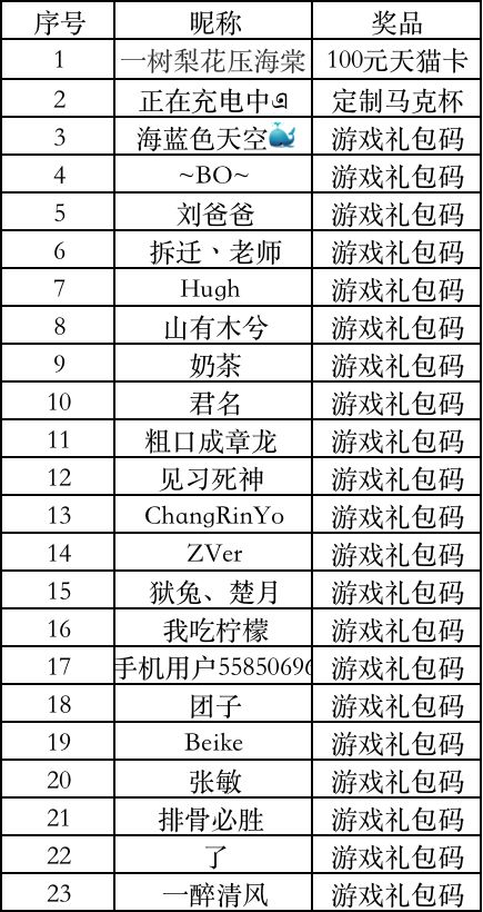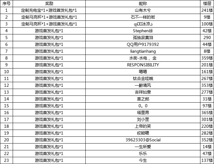 感谢领主们的热烈支持和分享~本期活动中奖名单如下!*首发礼包将通过预留邮箱形式发放邮件!(首发礼包码内容:传说英雄碎片随机箱*2、高级升星石*4、加速1小时*3、中级经验*3)*实物奖励兑换,建议在收到奖励邮件后,回复您的收件地址,以便安排对应奖励发放!(实物奖励兑换截止时间为1月20日17:00,请尽快按要求完成兑换!)-------------爷爷预约已久的游戏《领主总动员》终于要正