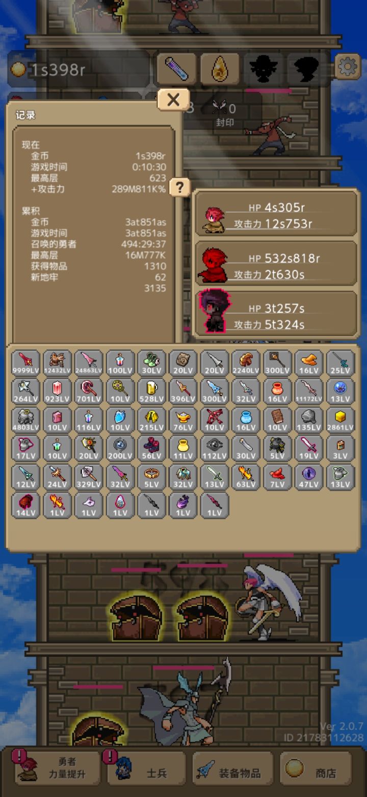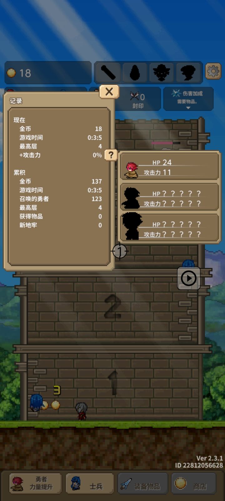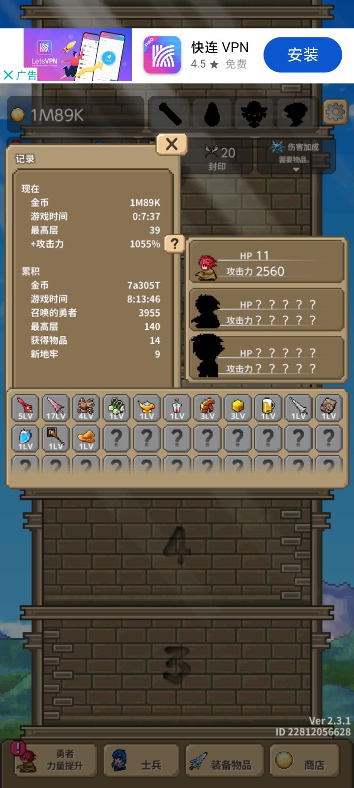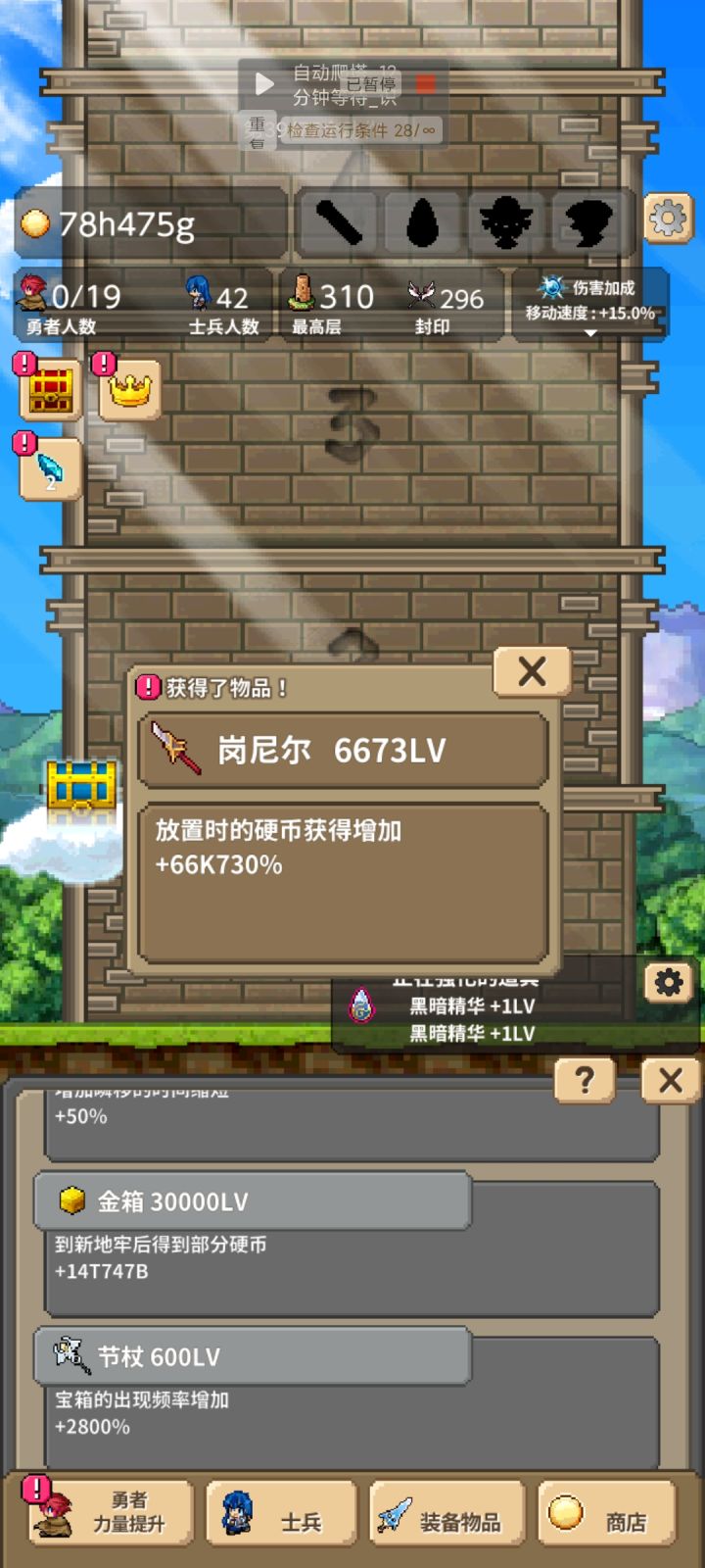 重新入坑了11.7 重新开局,第一次转生3小时,,,11.8 广告50次,火剑5级,攻击加成到了1000%,开局终于到了半个小时,100层11.9 攻击2600%,20分钟百层,不少道具到手,轻松了。。。#勇者之塔