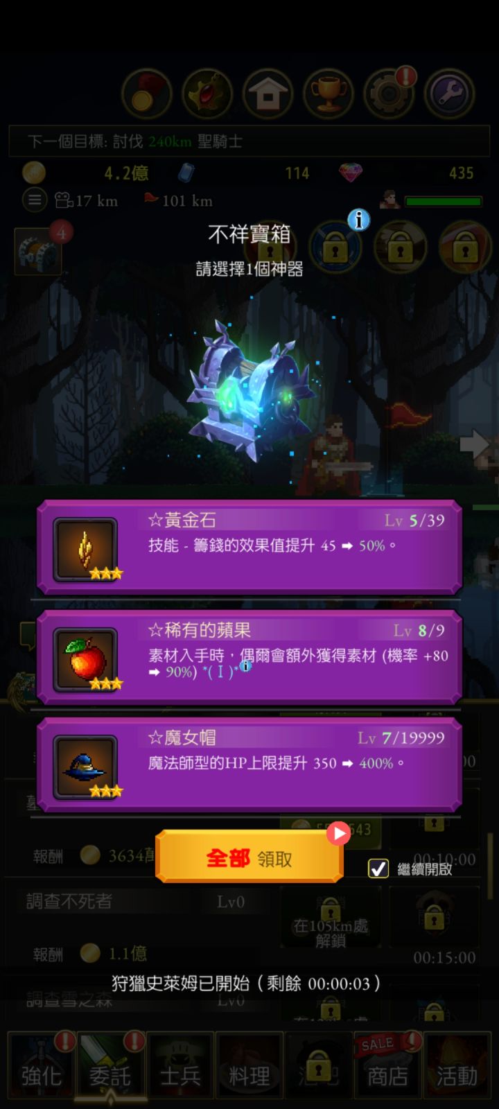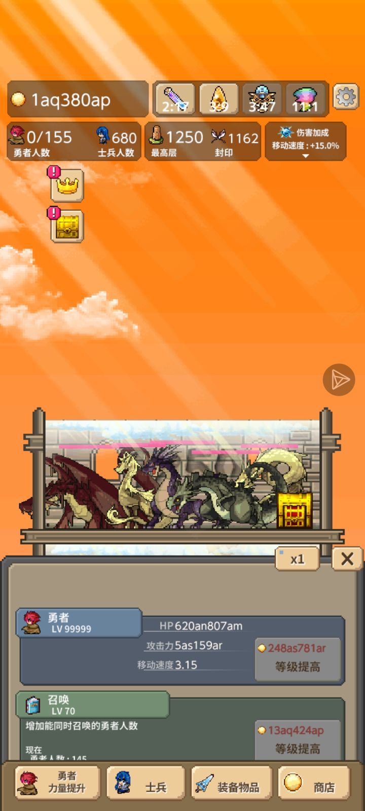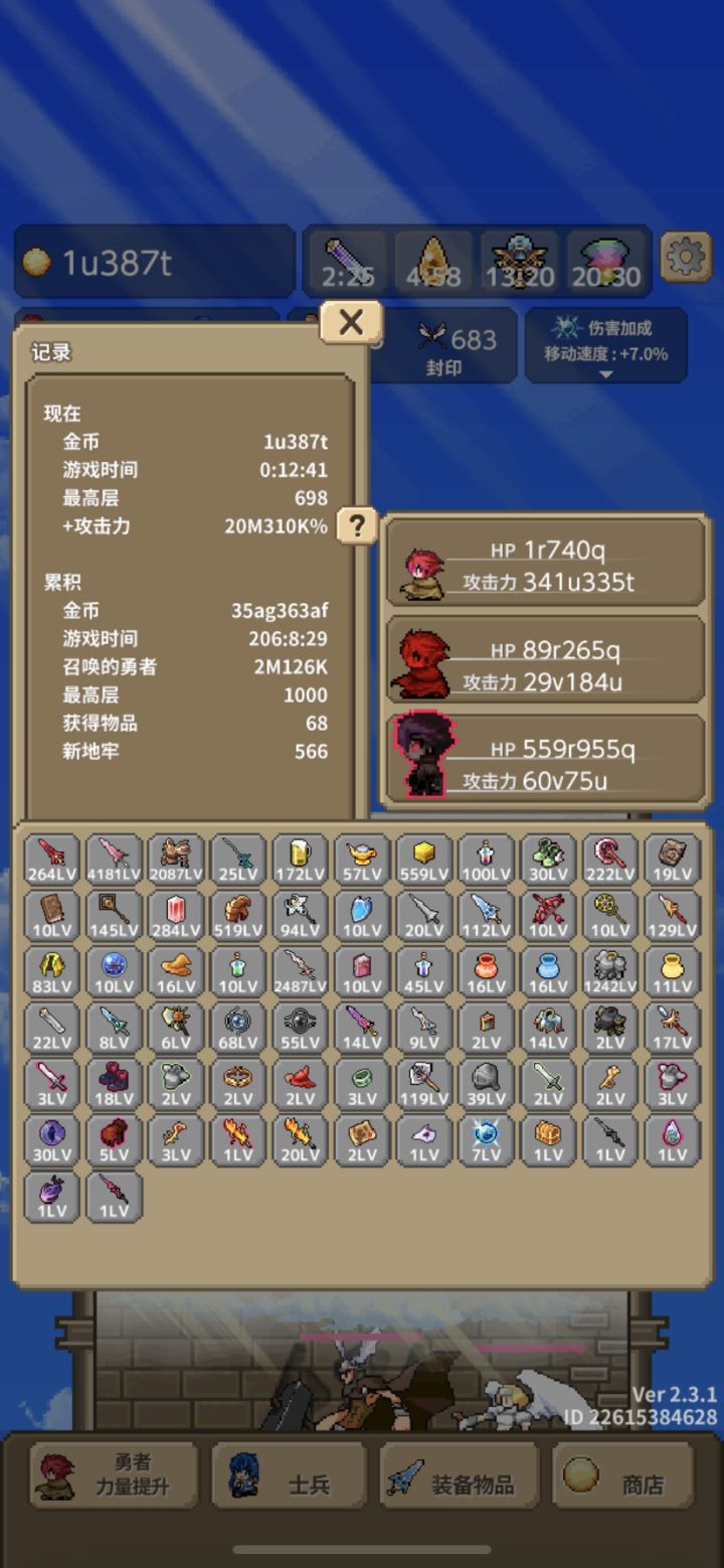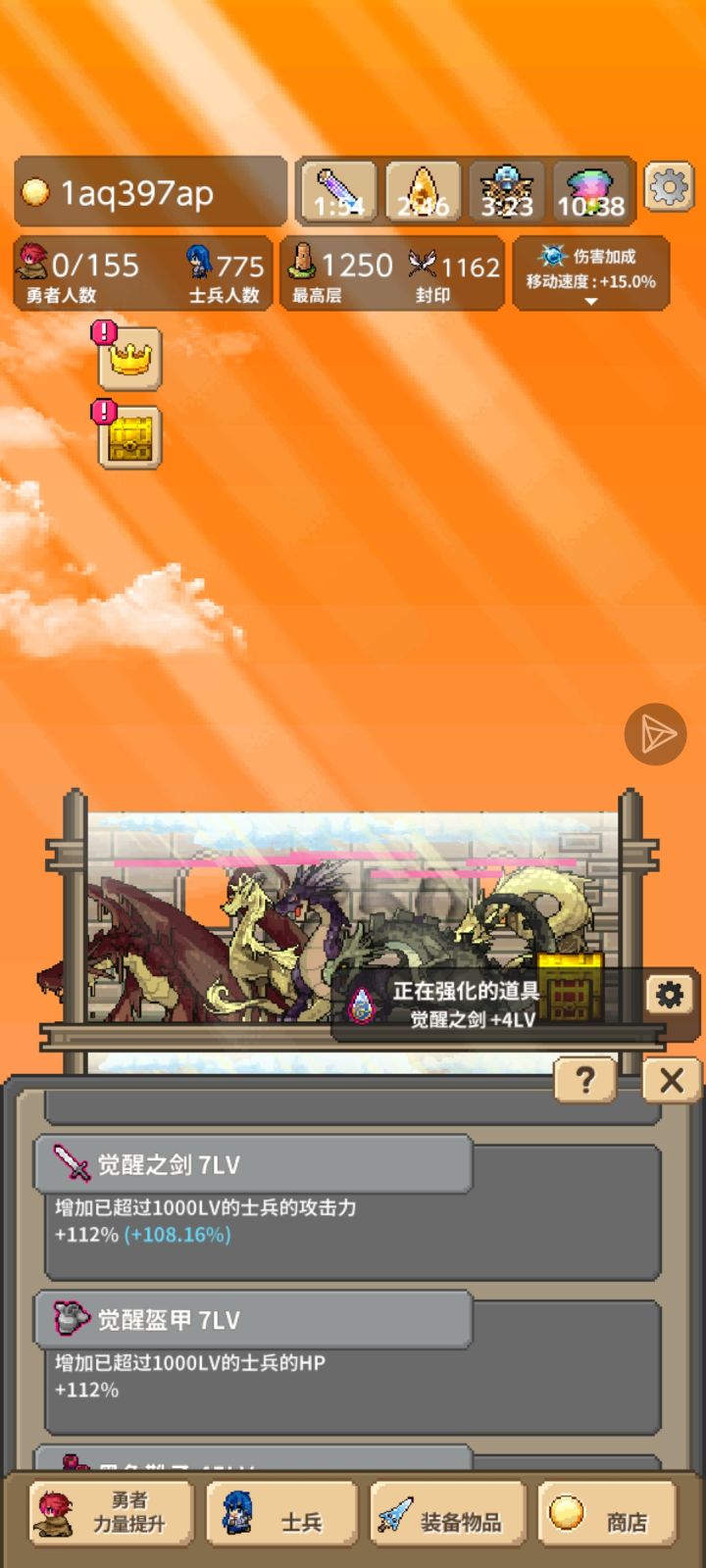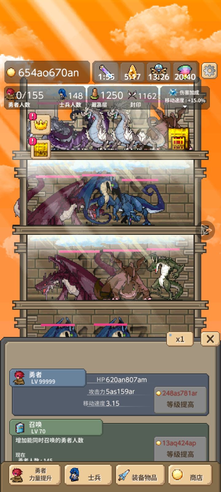 重新入坑了11.7 重新开局,第一次转生3小时,,,11.8 广告50次,火剑5级,攻击加成到了1000%,开局终于到了半个小时,100层11.9 攻击2600%,20分钟百层,不少道具到手,轻松了。。。#勇者之塔