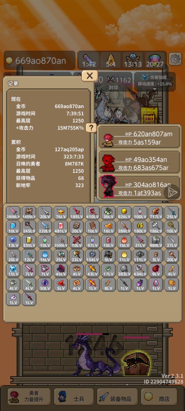 我是过来劝退的 自己看图吧 游戏时长 新地牢次数 大剑等级 我下载的是破解版 无限钻石的 可是无限钻石又怎样 装备升级又不用钻石 听说最高是2000层 我的1310算是进入游戏中期了😄