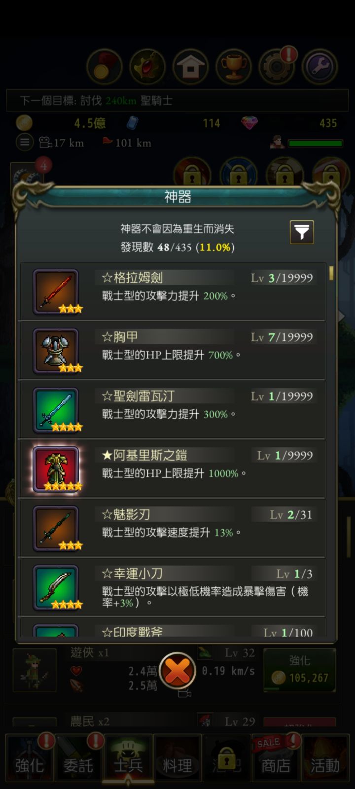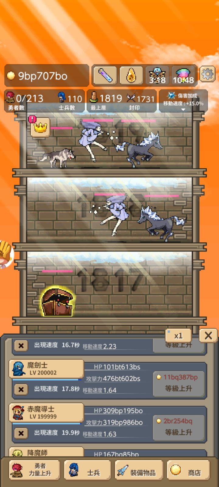 1819层剑士499999级→500000级 需要67bw金币(与{魔斗士99999级→100000级}需要的金币相近)比上次剑士199999级→200000级变得更艰难...看来,只能追加攻击力了...10000级以上士兵攻击力:8T410B%