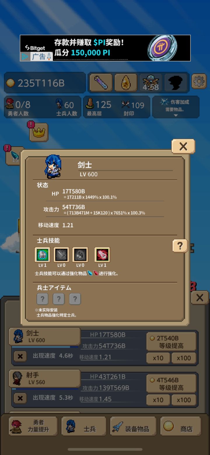 1819层剑士499999级→500000级 需要67bw金币(与{魔斗士99999级→100000级}需要的金币相近)比上次剑士199999级→200000级变得更艰难...看来,只能追加攻击力了...10000级以上士兵攻击力:8T410B%