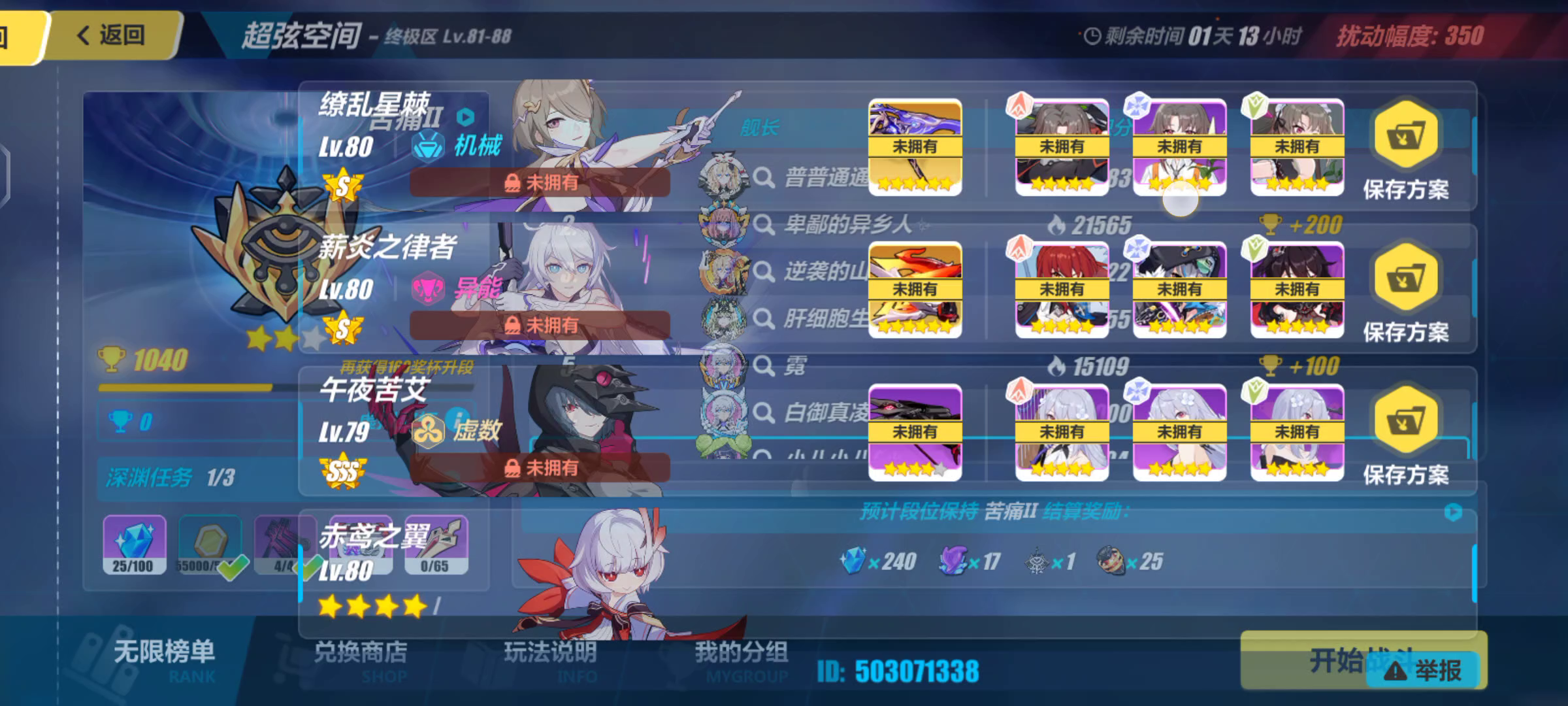 渠道1服 420扰动 配置: ss星塔 1485面板 s2云墨 戍阿戍 sss渡鸦 四星克莱茵