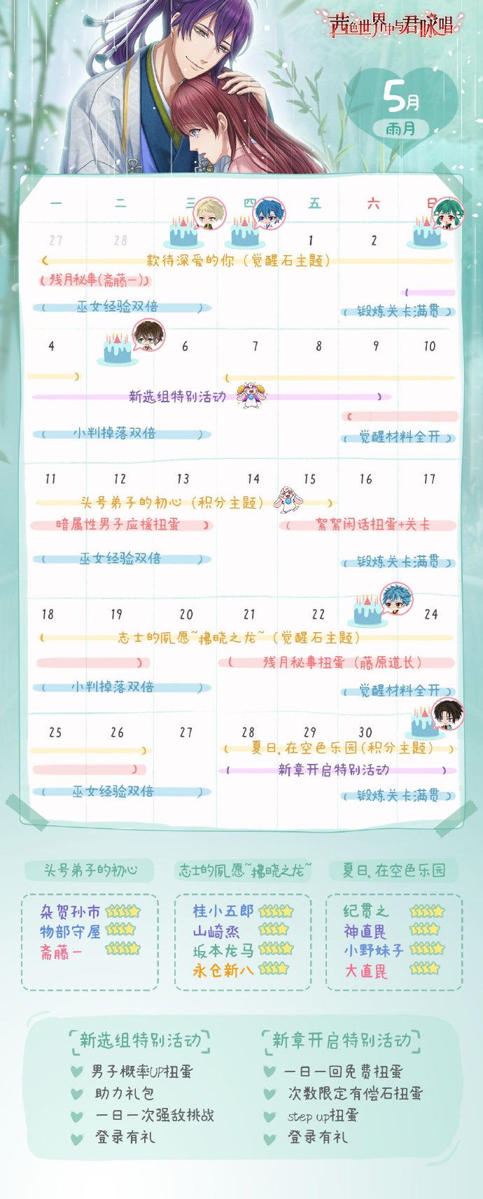 【男子扭蛋】残月秘事活动时间:4月23日维护后-4月28日12:00活动说明:活动期间将开启“残月秘事”扭蛋和关卡,在“残月秘事”扭蛋池进行召唤将有几率获得概率UP的斋藤一【装束:残月秘事】,首次通关“残月秘事”关卡将获得月华石奖励,请感兴趣的巫女大人千万不要错过哦~※ 活动结束后斋藤一【装束:残月秘事】将不会加入普通卡池或其他活动卡池;※ 活动期间雅之国<初始之森>将会出现3种难度的残月