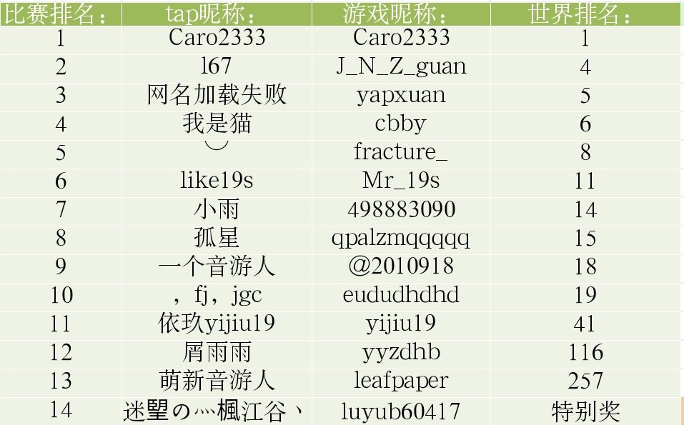以下是各参赛玩家的比赛排名和世界排名 世界排名是以整理成绩的时候的排名决定比赛排名,所以榜单上的世界排名与玩家参赛时的世界排名有所出入,且因不可抗因素(懒得翻),世界排名30名以下的玩家不做矫正,以参赛时上传的世界排名决定比赛排名(反正也就几个人参赛,矫正不矫正也没差) 要特别提一下的是特别奖选手“迷朢の灬楓江谷丶”,这位玩家本来是taiko模式大神,他跨专业参赛,虽然打出来的成绩没有上传到服务器