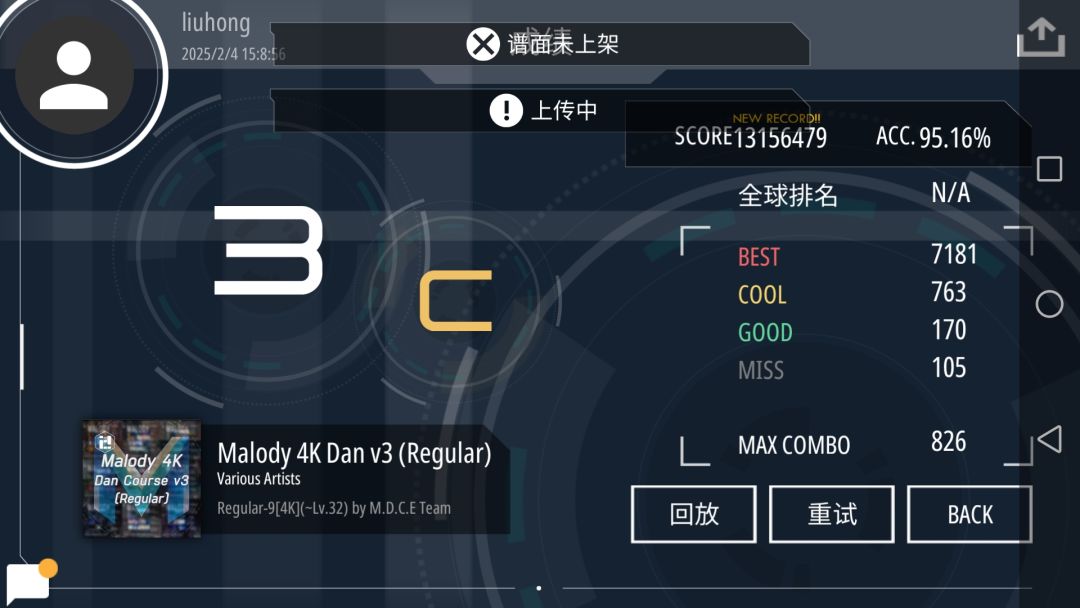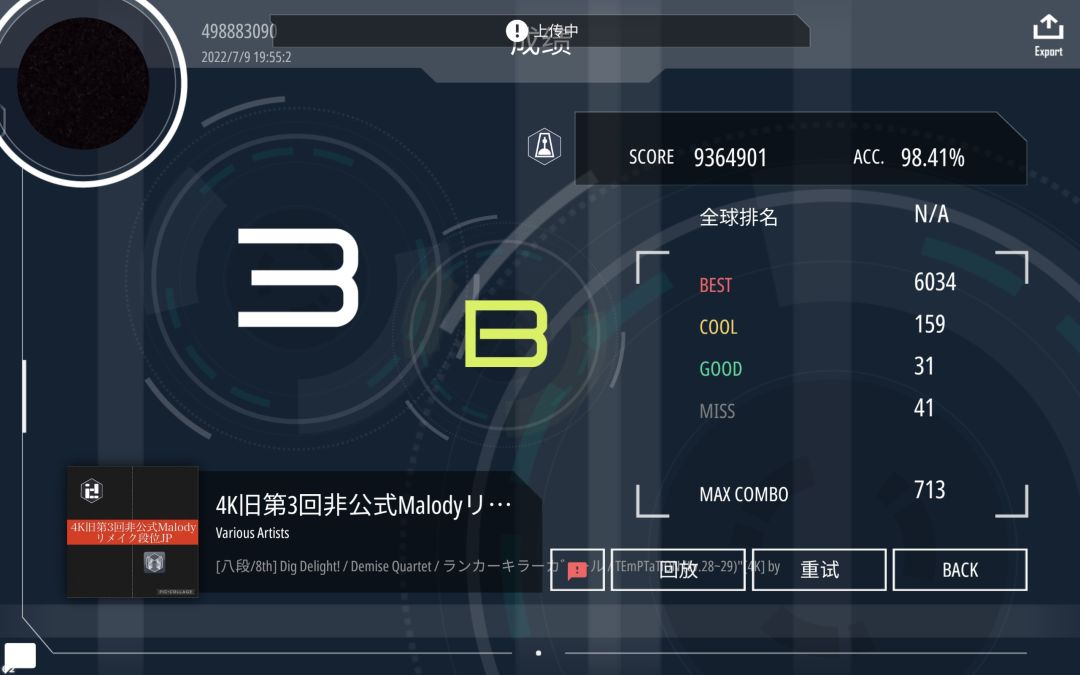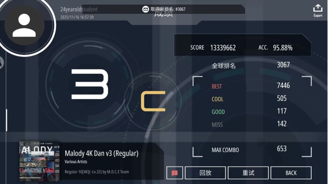 继去年5~6月两个月连过12两段以来,在近期打切状态最好的时候(见自我介绍1 < https://www.taptap.cn/moment/584148217852070140 >的第2部分;具体来说,这次是今天晚上8点左右)把(pc端)常规3dan过了。 - 图1:检查过段回放文件时的截屏 图2:最近部分几次练习的时间与分数 图3:从官网上的个人主页截的分数 - 叠:开头的地方用对拍糊的,切夹子