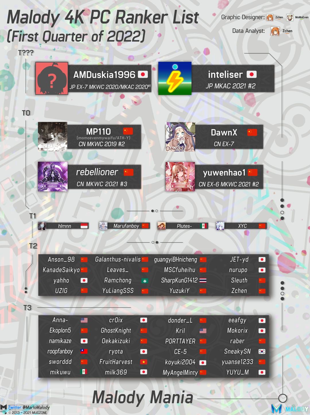 是2022年第一季度的4K Ranker表,运营组的Staff们参考Stable 25-34的E判Acc判定分成多个梯队制作而成,如今有了许多新面孔,期待下次的变动