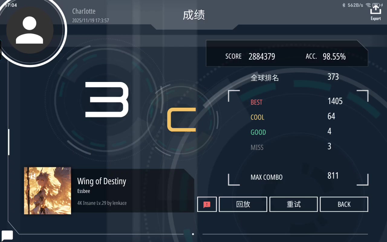 96.47-95.97-95.59-95.88时间:2025.11.16 16:58实际上我8dan9dan也是16日凌晨打的,所以这也算是一天连过三段(?)可能是你游最快连过这三个段的人之一。10dan叠说实话还是有点难的,bpm虽然跟9dan叠差不多,但是键型卡手许多,因此比9dan叠难不少,初见只有96.11,过段的时候也只打了96.47。另外技乱这两样也都让我读谱不能,而切反而回血了