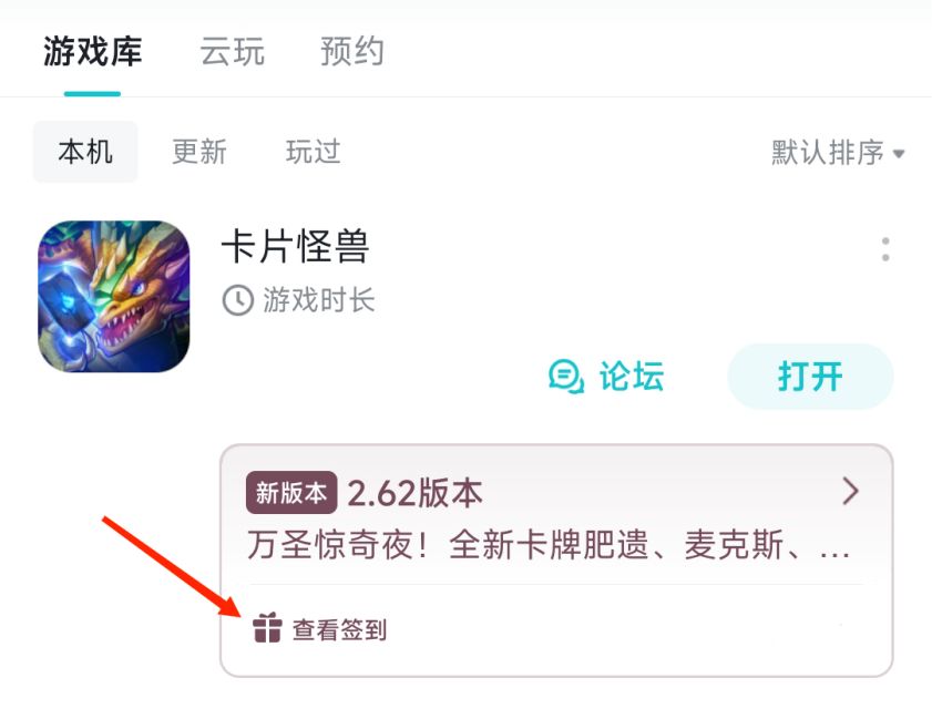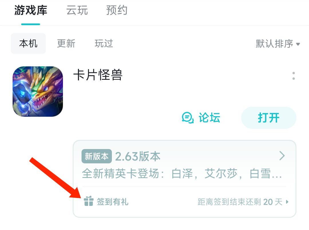 亲爱的牌友们,《卡片怪兽》2.62版本已经上线,11月的TapTap官方社区福利活动现已正式开启~ 11月签到领福利 签到活动时间:11月1日0:00 ~ 11月20日23:59 参与方式:TapTap《卡片怪兽》签到活动页面 签到地址: 或者前往我的游戏-游戏库找到《卡片怪兽》,点击「签到有礼」选项进入活动页面。 活动期间内,累计签到满对应天数即可获得相应奖励的礼包码,可用于游戏内兑换奖励。
