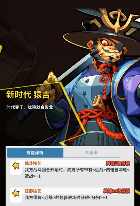 【通行证换季】 新一季的通行证将在2021年的9月与大家见面,同时我们也将推出一位新英雄:新时代 猿吉 英雄技能: 战斗技艺——我方战斗回合开始时,我方所有带有<近战>的怪兽本轮<近战>+1; 狂野技艺——我方带有<近战>的怪兽进场时获得<狂扫>+1; 娴熟技艺——一回合一次,我方一号位的怪兽被消灭时,免疫消灭效果并且当前生命值变为1(一场战斗中只能触发2次且每只怪兽只可触发1次); 新时代猿吉 除