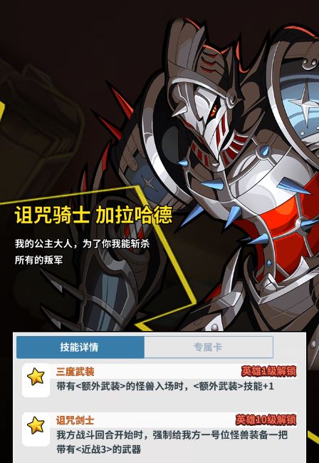 【通行证换季】 新一季的通行证将在2021年的3月与大家见面,同时我们也将推出一位新英雄:诅咒骑士 加拉哈德 英雄技能: 三度武装——带有<额外武装>的怪兽入场时,<额外武装>技能+1; 诅咒剑士——我方战斗阶段开始时,强制给我方一号位怪兽装备一把带有<近战3>的武器; 反击剑士——一回合一次,我方一号位的怪兽被敌方怪兽破坏时,给予那只怪兽无视护甲的<近战>伤害(一场战斗中只能触发2次); 诅咒骑