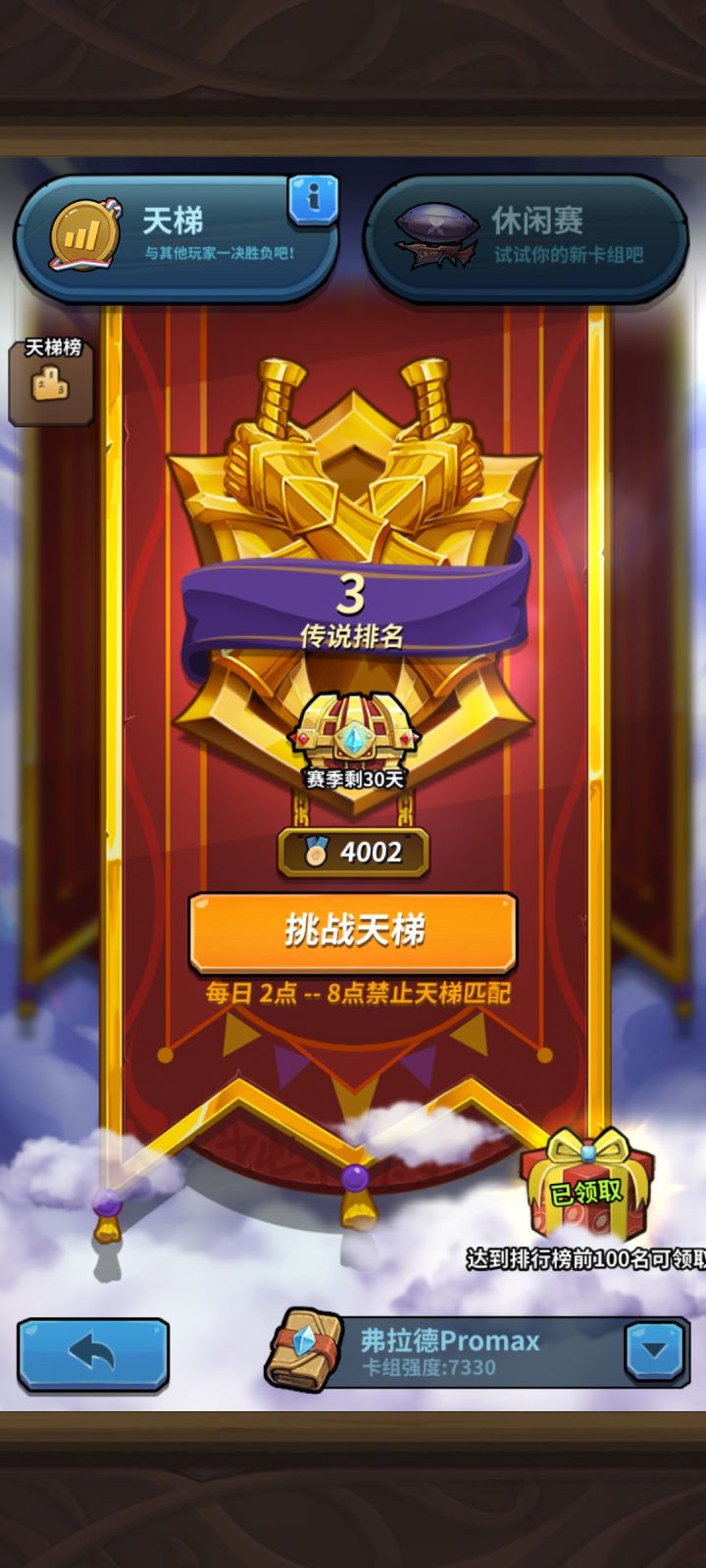 开局抽到领主和蓝龙果断玩紫后面两张附上前4天的卡组跟今天的卡组,上彩钻之后卡牌质量跟不上被血虐,今天登陆第5天送的艾斯,攒的80彩石兑换的神之制裁,刚打的龙蛋,一路高歌上彩2后面继续努力,争取早日上传说单卡和打法介绍1.银紫血腥夫人:满级三费四骰八血带法术反弹,造成物理法术骰子伤害回一滴血,非常优秀的单卡,开局可以直接上场,挨打后搭配一些低费加护盾,加物,法攻击的装备,可以回2-