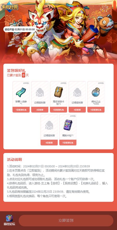 亲爱的牌友们,《卡片怪兽》新春版本现已上线,TapTap官方社区2月社区福利已经开启,赶快参与活动领取福利吧!2月签到领福利签到活动时间:2月1日0:00 ~ 2月20日23:59参与方式:TapTap《卡片怪兽》签到活动页面签到地址:在《卡片怪兽》详情页左下角-活动(ios请点击详情页右上角详情选项-福利),点击进入“签到”活动。或者在游戏库中找到《卡片怪兽》,点击「签到有礼」进入活动