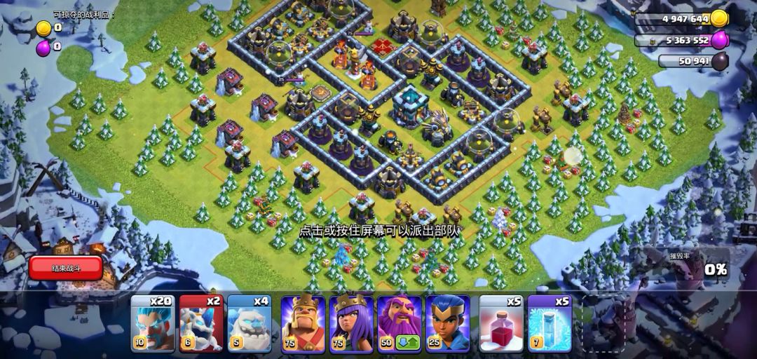 第一步:5个圣诞奇袭放在图示位置,会闪掉土炮,闪不掉连弩(为了清边和减少地面输出,让蛮王开墙进大本营) 第二步:下主力部队,次序为『蛮王☞3冰人☞女王☞永王,闰土』,先下蛮王是为了拉住地面弩伤害,使冰人不至于太早爆开,冰人下的开一点 第三步:在闰土即将打完法师塔的时候如图下一个冰狗,这个冰狗要拉住女王仇恨,爆炸后还要激活大本,少了一样就重来 第四步:要么闰土爆本,要么其他的王进去爆本,没爆本走偏或