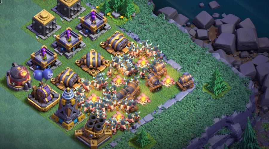 夜世界到达八本阶段以后,进攻的一方会迎来很大的便利,因为八本时增加了第6座兵营,让投入的进攻兵力得到增加。这也是夜世界速本非常流行的原因,即使在八本初期,凭借多一个兵营的兵力优势,也可以碾压七本后期的对手。八本地面流打法不挑阵型,可以说是一种万金油的打法,今天我们推荐一套狂暴野蛮人和加农炮战车组成的地面流,这两种兵种在八本后,升级到16级时都有不小的加强。 【兵种组合特点分析】 配兵方案:4个兵营