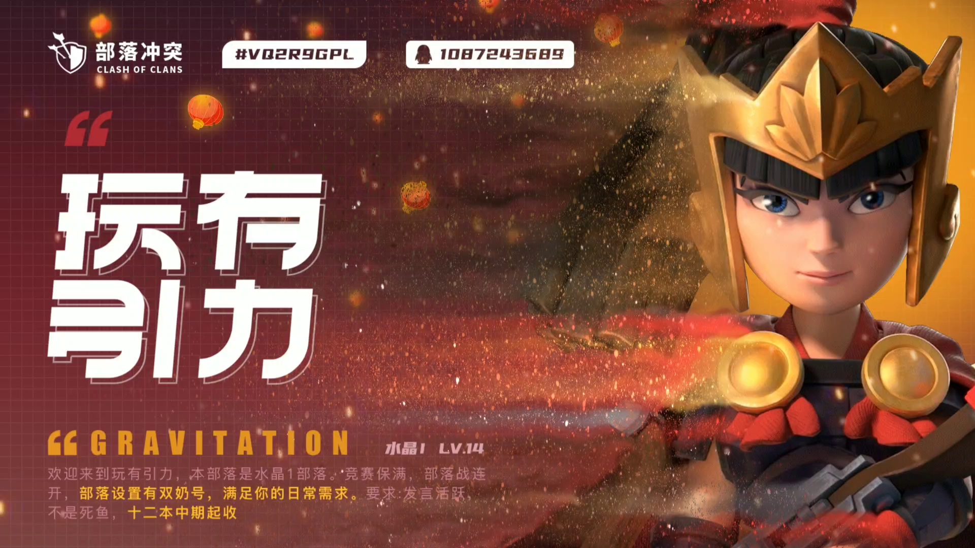 部落名字:玩有引力(游戏里搜部落名即可) 部落标签:#VQ2R9GPL Q Q群:1087243689 招人要求:12本中期活跃, 速本勿扰!! 部落有奶号,满足大家日常收兵需求! 水晶1联赛