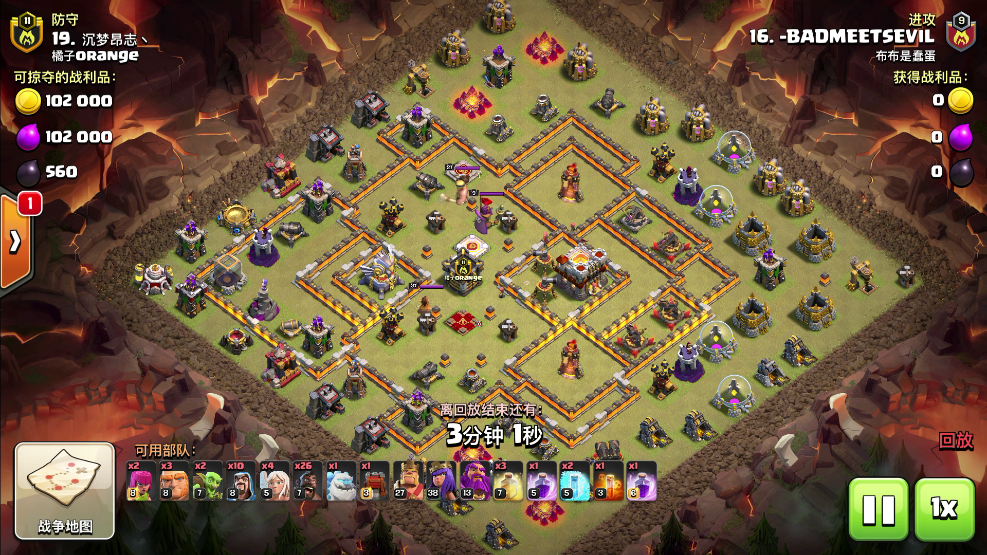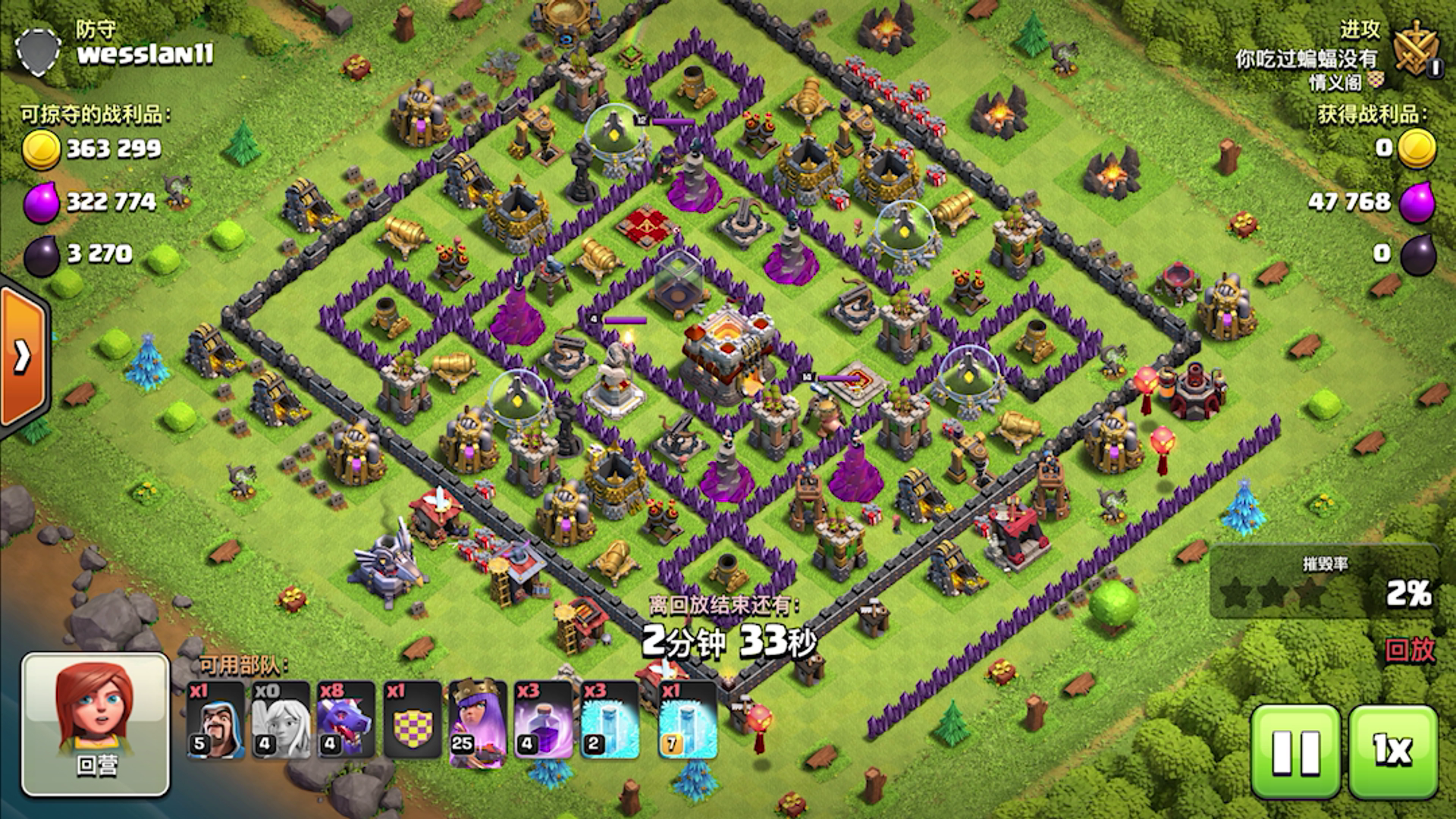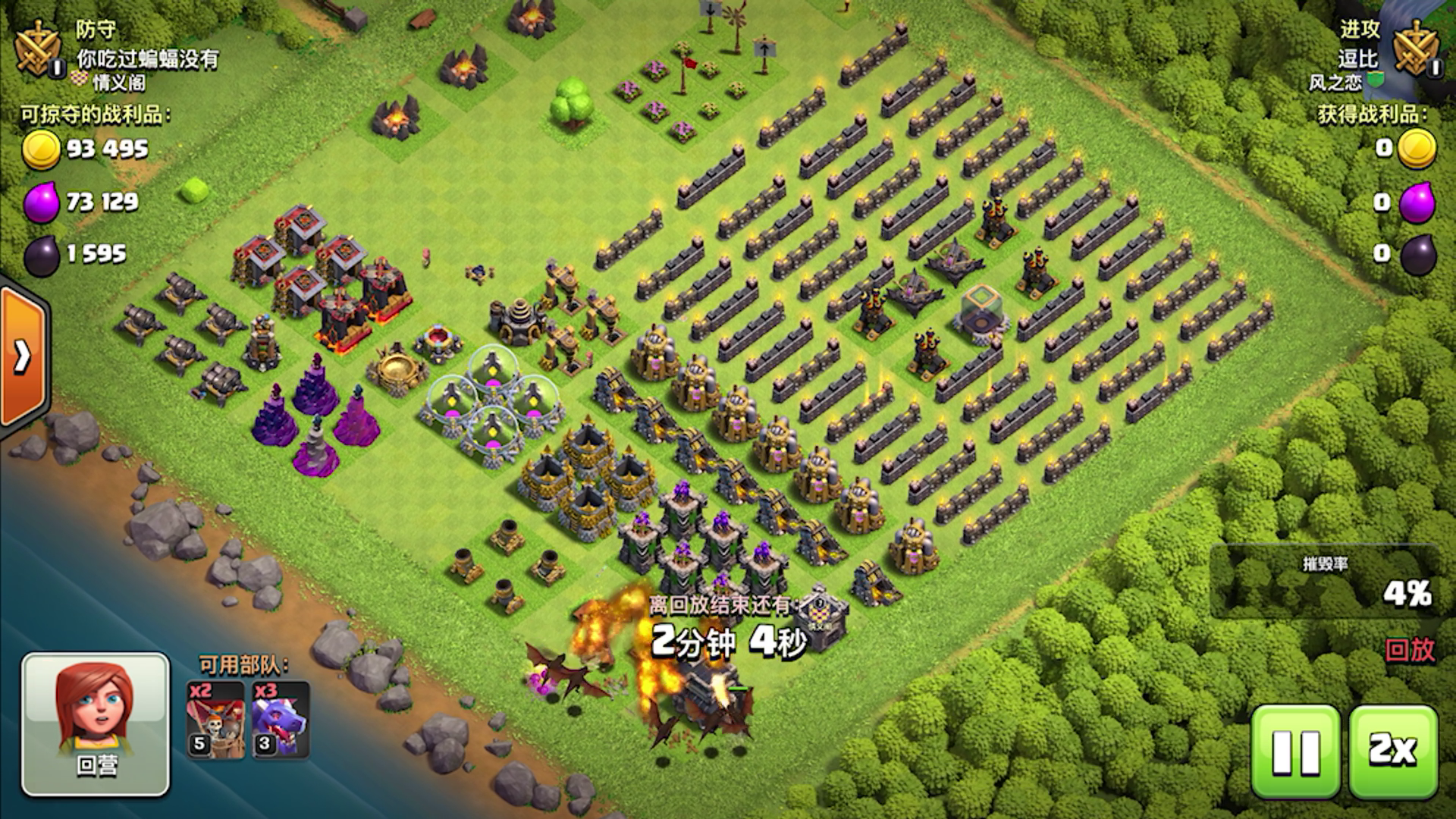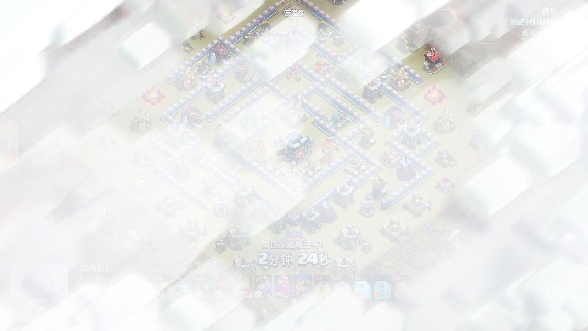我自己打的.把13本满防平了.我下兵的时候有2个细节 1、法师把蛮王的平台建筑打掉.避免女王跑偏 2、提前丢狂暴.给炸弹兵加伤害.避免开不了第二层墙.(可以看到车是残血开的第二层墙) 这2个细节少了一个估计都平不了 有什么想法可以评论交流哦