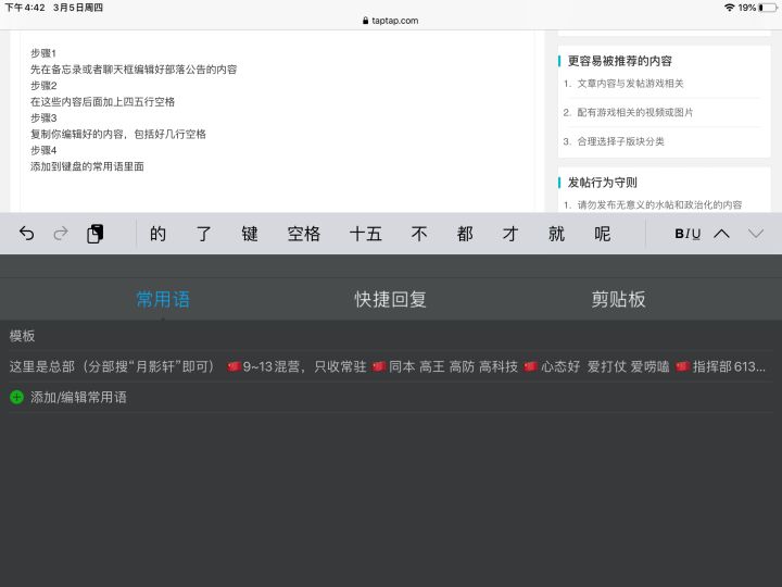 肯定很多人都知道了这种方法哈,求轻喷😅但去过好多部落,居然都很少看到整齐的版面,所以这里就想分享出来,让更多首领看到步骤1先在备忘录或者聊天框编辑好部落公告的内容步骤2在这些内容后面加上四五行空格(不是换行是空格哦)步骤3复制你编辑好的内容,包括那好几行空格。然后添加到键盘自带的常用语里面,如图步骤5编辑部落公告的时候,点完常用语赶紧保存即可,如图