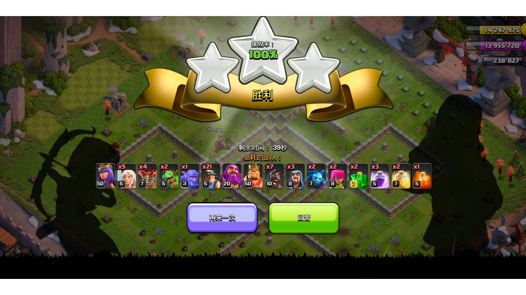 先用哥布林打掉大本营旁边的收集器 然后再下狂暴弹跳和极速隐身药水去解决掉大本营拿下一星 多余的哥布林用来清理防空火箭旁边的收集器 剩下就用龙宝和三王去补百分比 从而用这种方法去冲杯