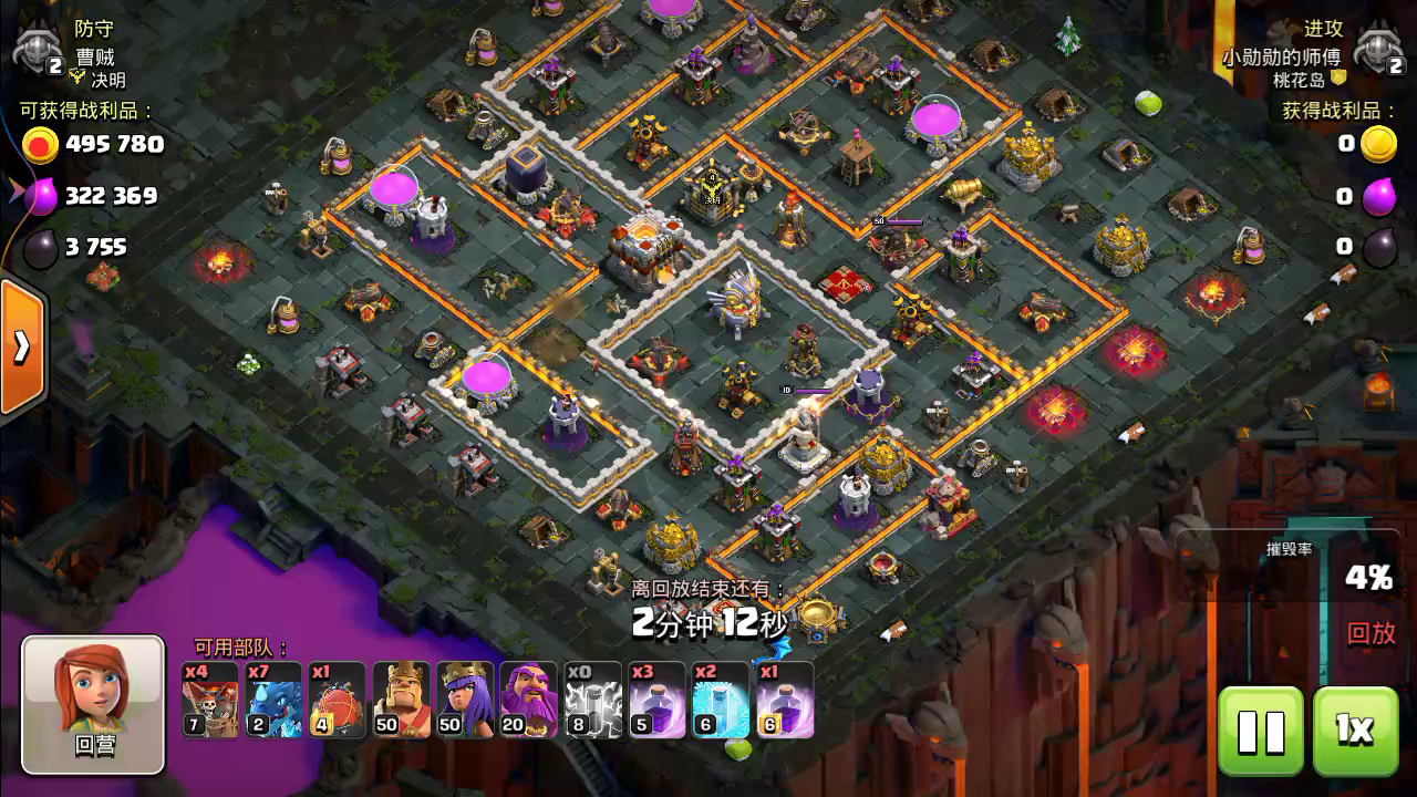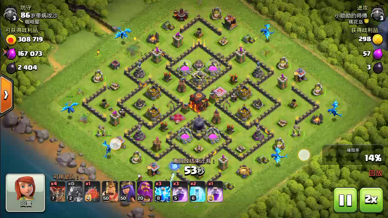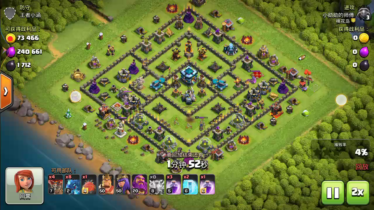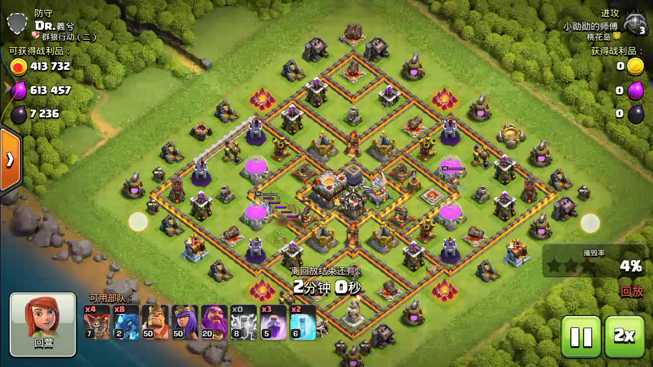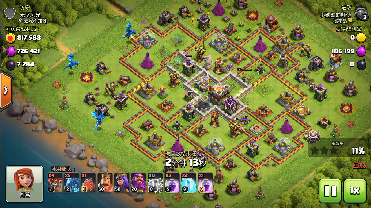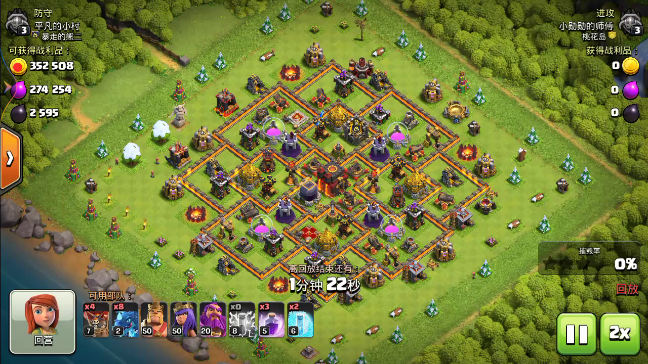 先放两个炸弹人炸开城墙,顺便清理一下附近的建筑,然后放出建筑大师和超级皮卡吸引主要火力(主要是吸引迫击炮和夜壶的范围火力),接着抛出全部黄毛分左右两队从城墙缺口涌进去,直切敌方大本营并捣毁沿途建筑,拿下两星! · 嘻嘻