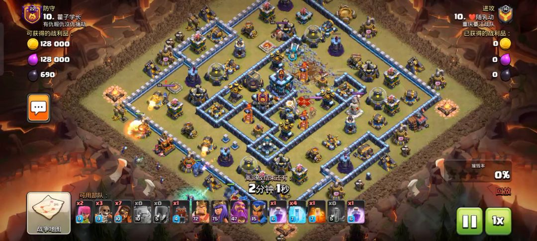 12本打14本打了2星72,对面的防御虽然不算合格的14本,但我的英雄也没满,等级也不算12本的高级,对面的防御怎么说可以算13本吧(满援军打联赛很正常,不要喷什么用14本援军,就算对面有援军,狂暴天女加毒药就解决了,可以看到我最后省了瓶毒药)